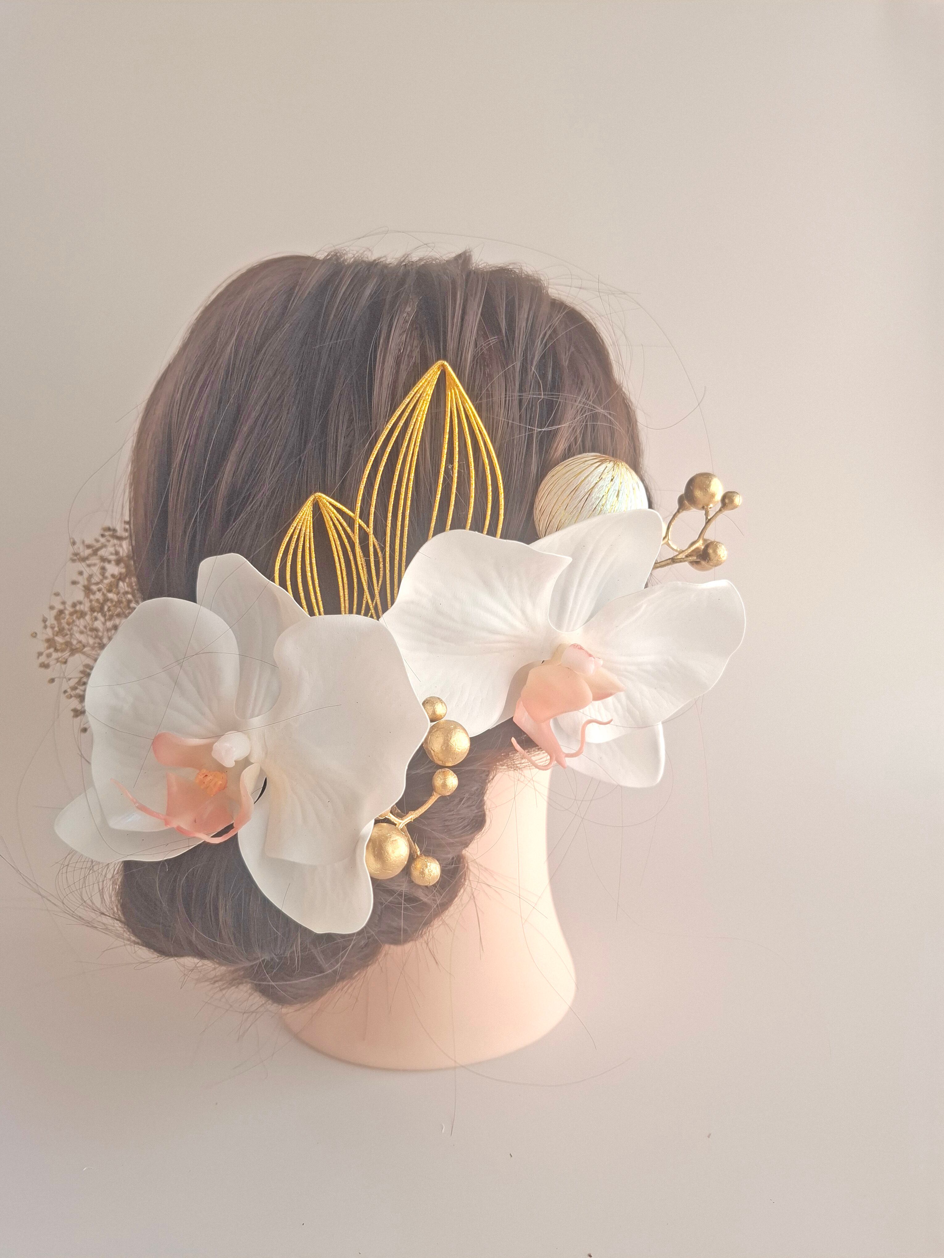 このホワイトピンク胡蝶蘭とゴールドかすみ草の髪飾りで、華やかさとエレガンスを両立させたスタイルを楽しんでください!