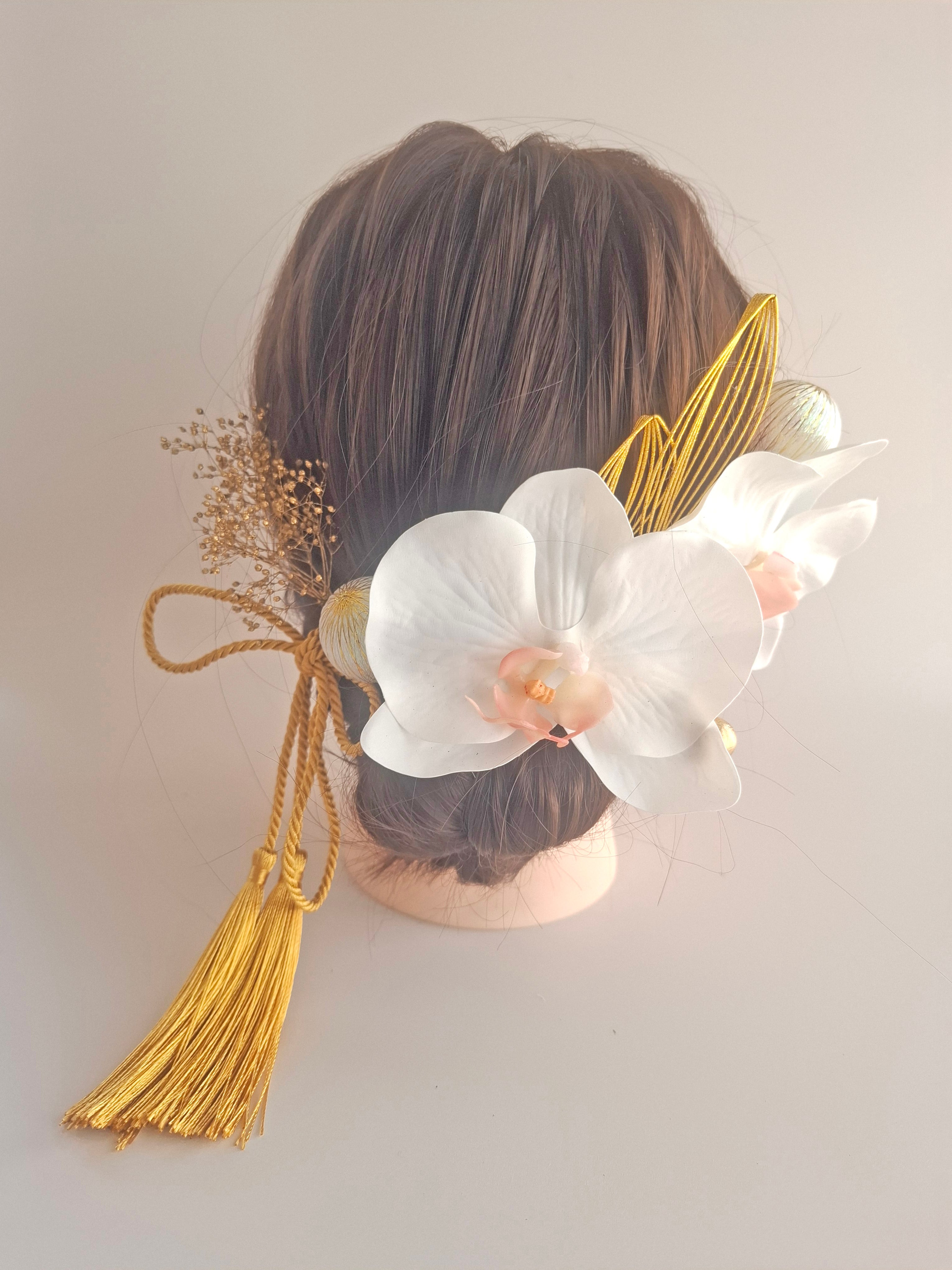 優雅に咲き誇るホワイトピンクの胡蝶蘭と、ゴールドかすみ草が華やかさを引き立てる美しい髪飾りが完成しました。