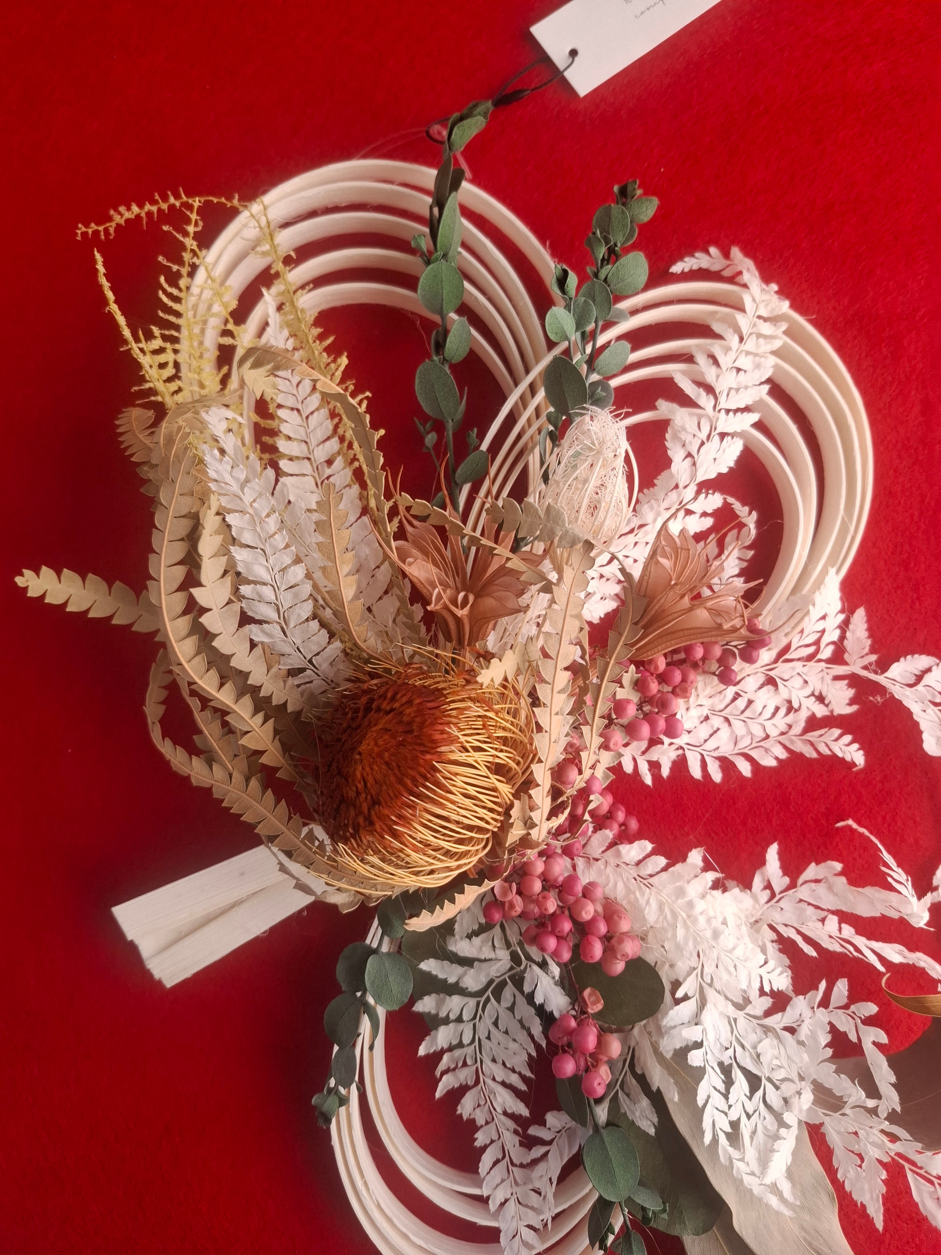 ラタンが土台のお飾りにプリザーブドフラワーやドライフラワーをあしらった洋風のお飾りです。