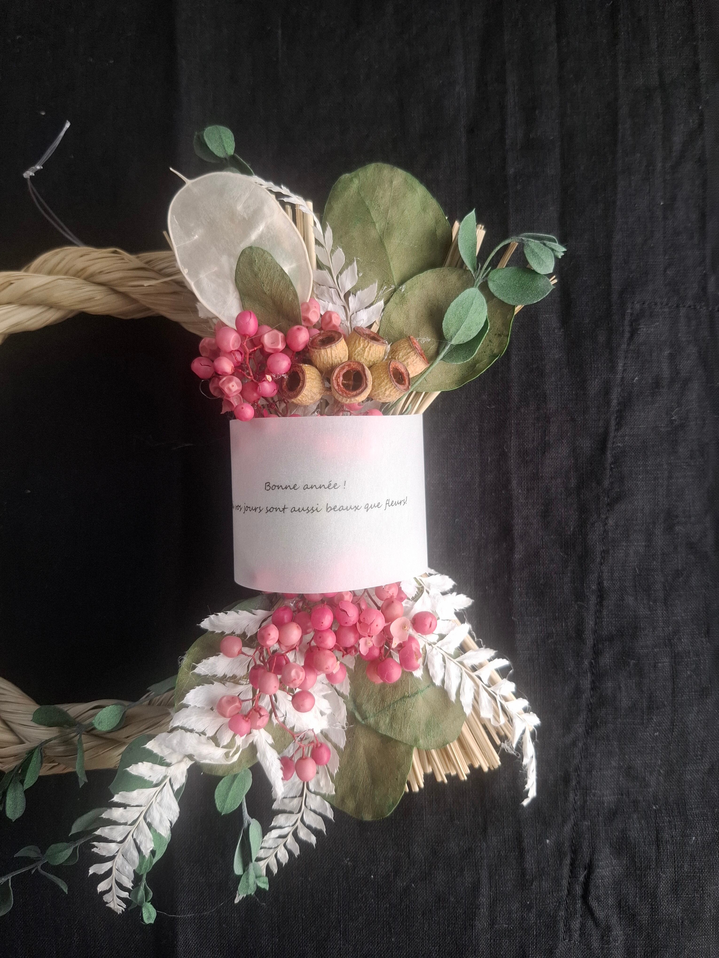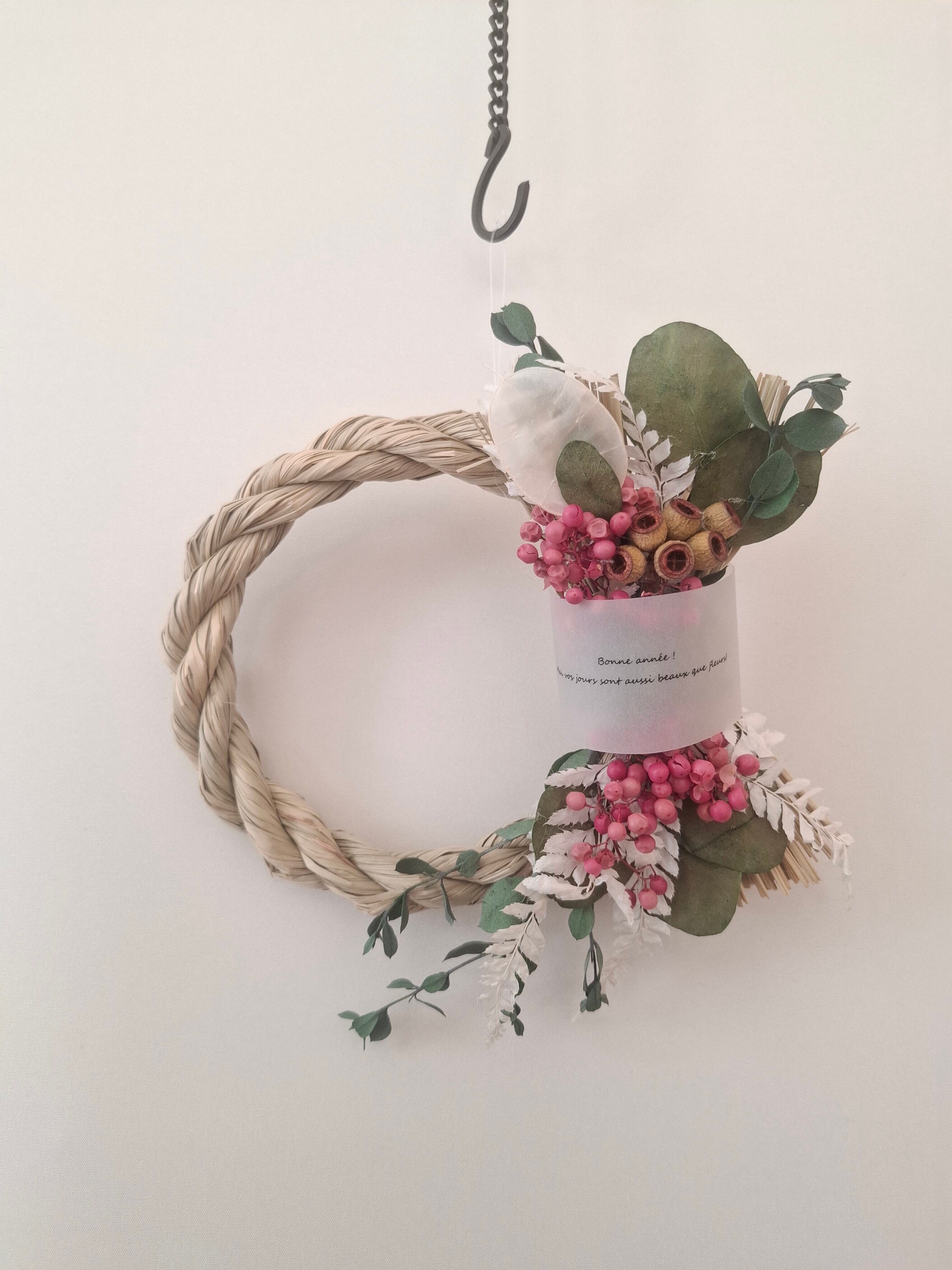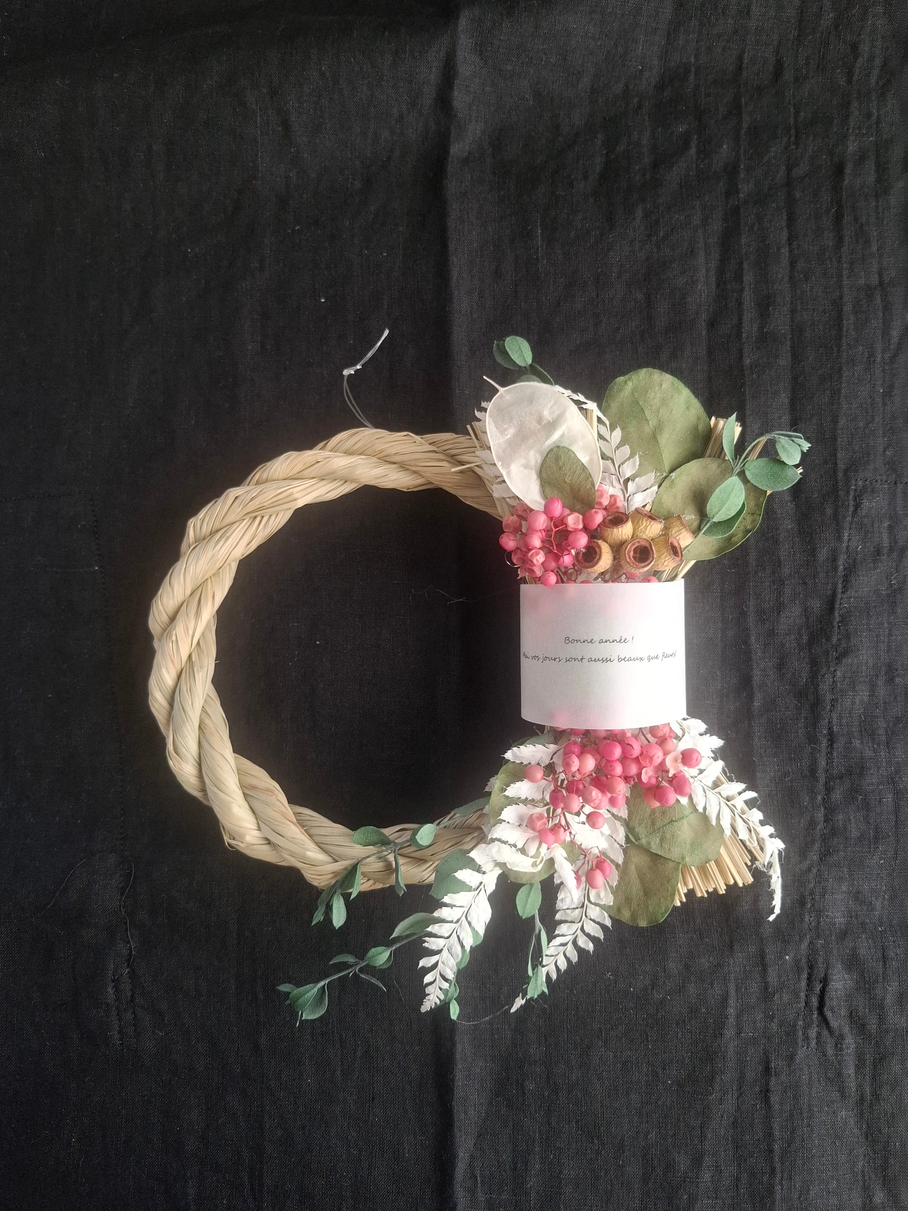 日本の伝統的なしめ縄飾りに、可愛らしいピンクペッパーベリーやユーカリなどのグリーン、木の実を使った、和洋ミックスのお飾りです。