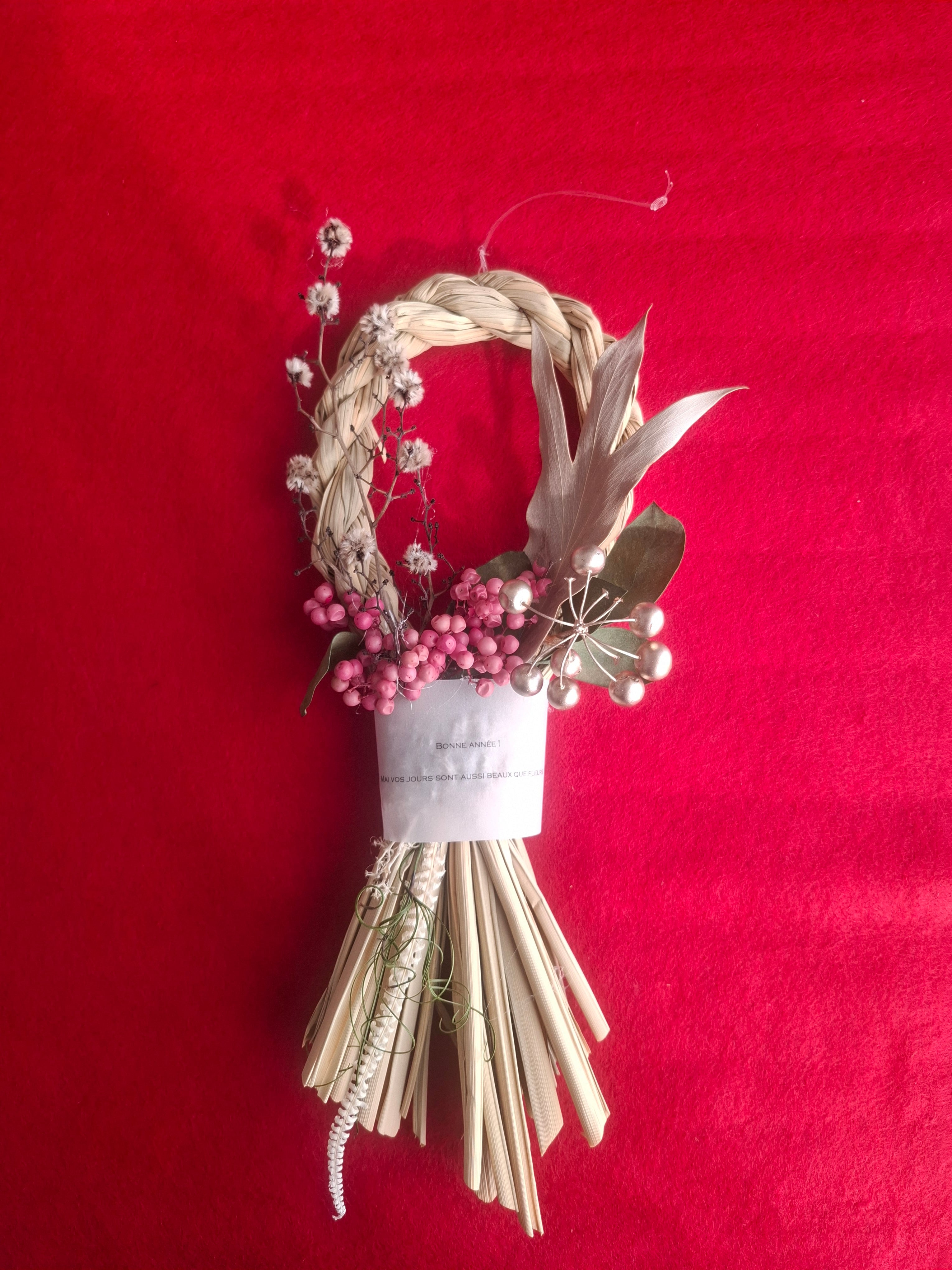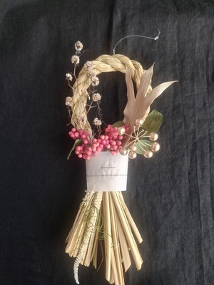 まるでタッセルのような個性的なフォルムのお飾りにふわふわの実がついた植物や可愛らしいピンクペッパーベリやグリーンで制作したお飾りです。