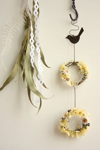 リース&リース(イエロー) サイズ:約26×7cm アイアンのモチーフと小さなリースを組み合わせたcomfortable placeの定番のリースです。 小ぶりですので、キッチンや洗面スペースなどにも気軽に飾っていただけます。 個性的なフォルムのリース&リースはご自宅用はもちろん贈り物としても人気です。 レモンクリームカラーのあじさいをメインにした作品です。