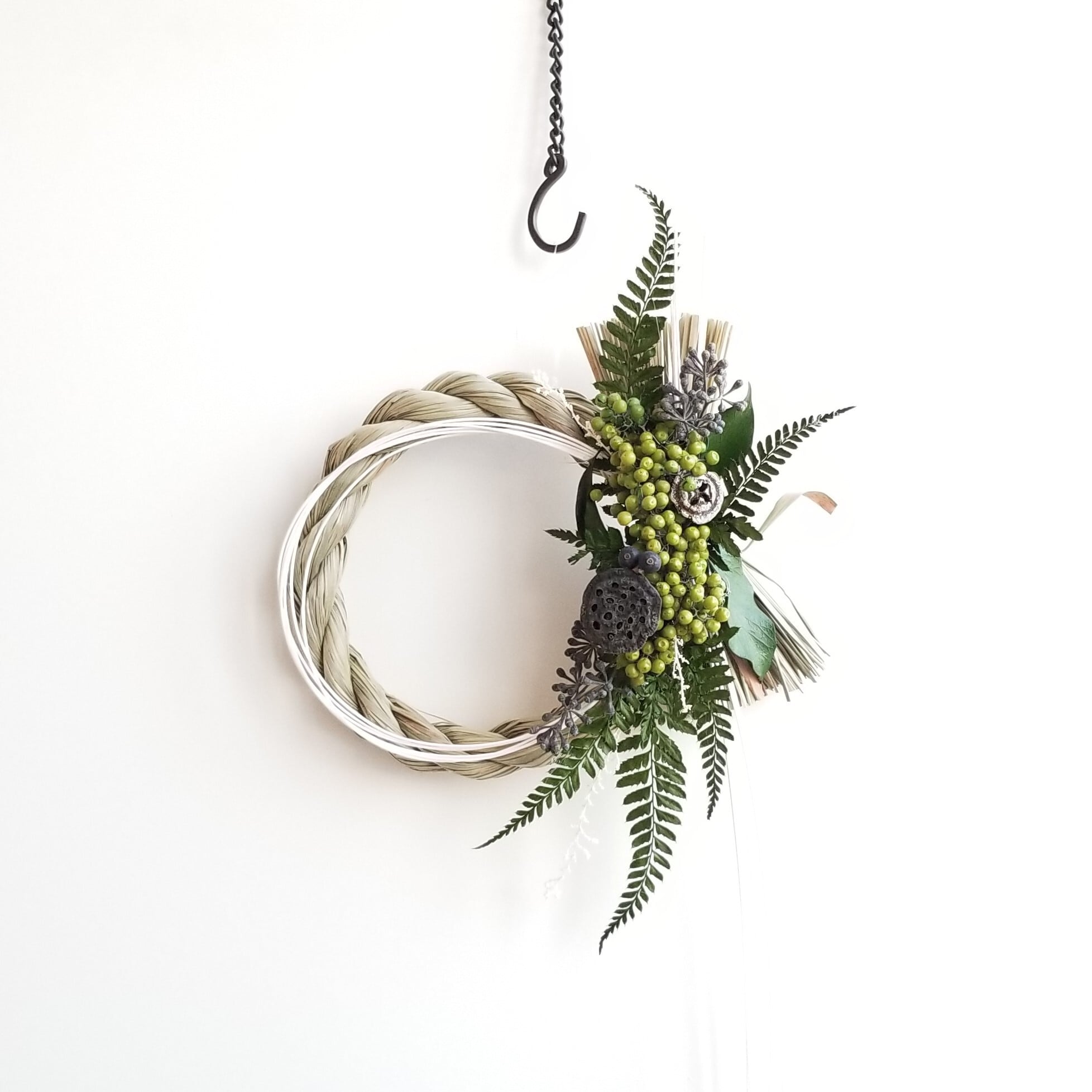 しめ縄~グリーンペッパーベリ 直径約29(水引含む50)×20cm 藁で編んだしめ縄の土台にプリザーブドフラワーをあしらったお飾りです。 こぼれんばかりのグリーンペッパーベリー・ブラックロータスやグリーンや木の実のプリザーブドフラワーを使用しています。 和風過ぎず、洋風なインテリアに合うお飾りです。 ご自宅のインテリアとトータルコーディネートもできます。一点物です。
